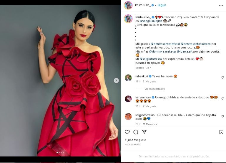 La aclamada conductora demostró su gran sentido de la moda, luego de posar con un encantador vestido rojo en InstagramCiudad de México.- La aclamada presentadora de televisión, Kristal Silva, logró conmover a su fieles seguidores de las redes sociales y el público de TV Azteca al compartir su gran sentido de la moda fuera de los foros del Ajusco, donde lució de lo más maravillosa ante las cámaras dele espectáculo.