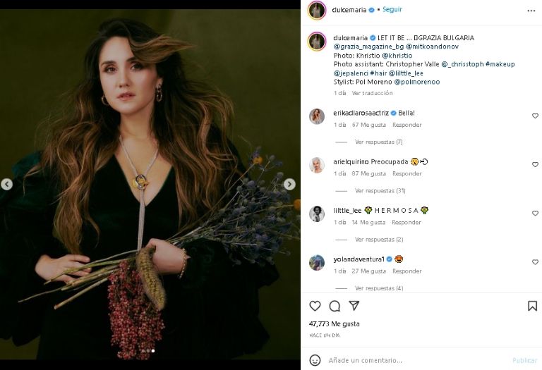La querida cantante y actriz lució un distinguido outfit verde desde su cuenta ofifcial de Instagram y enamoró a sus fieles fanáticosCiudad de México.- La querida cantante Dulce María volvió a demostrar su gran sentido de la moda frente a las cámaras del espectáculo, y esta vez no dudo en compartir su distinguido look de otoño vía Instagram con unas impactantes fotografías. Una publicación que dejó en shock a todos sus seguidores de las redes sociales y que sigue siento tendencia por toda Internet.