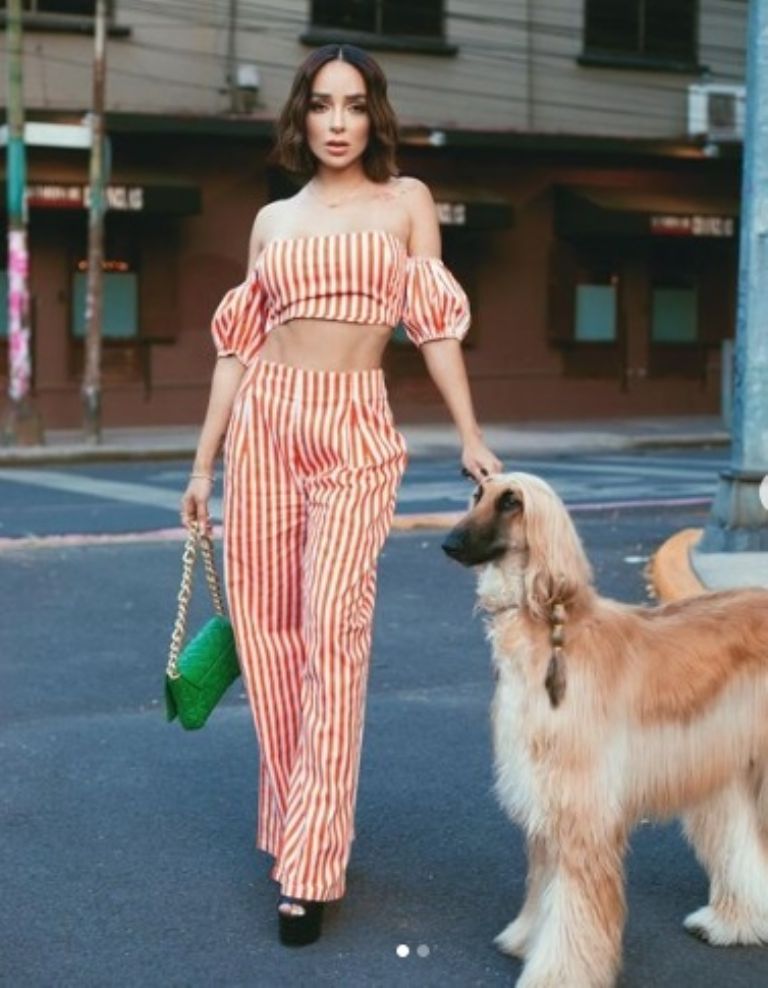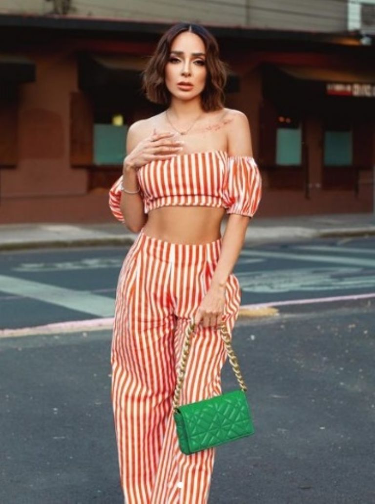 La modelo es toda una amante de la moda, sabe de tendencias y la manera de resaltar su belleza, por lo que esta vez sorprendió con un conjunto a rayas naranjas, el cual consta de un pantalón de pierna acampanada y un top en corte campesino, como accesorio optó por un bolso verde y una cadena, mientras que en su cabello optó por unas ondas desenfadas para darle un toque casual.