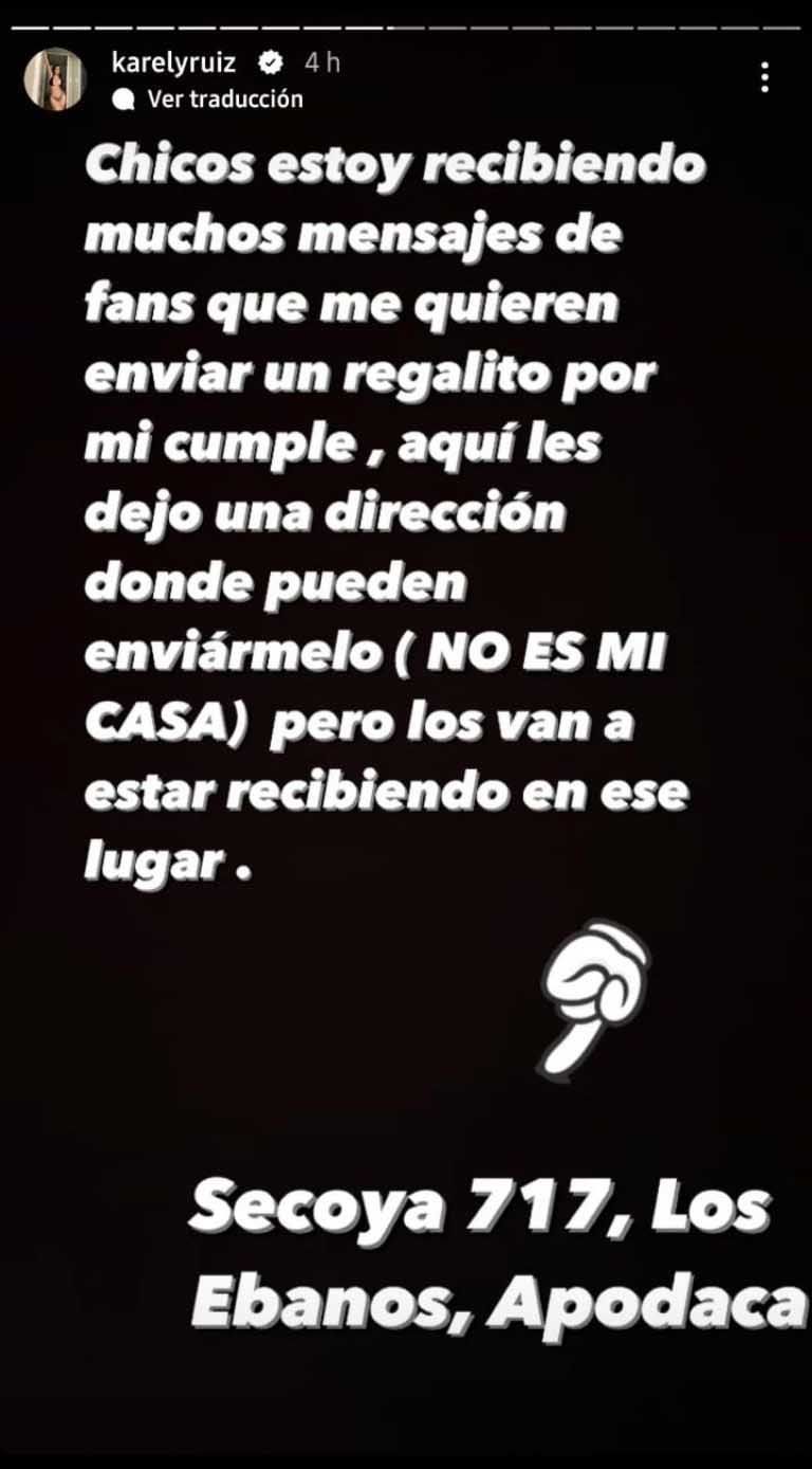 Por esta razón, Karely decidió compartir a través de sus historias de Instagram una dirección en la que estarían recibiendo los regalos de quienes deseen enviárselos, así como una cuenta bancaria, razón por la que le llovieron críticas de parte de sus detractores, pues no tomaron a bien está acción y de interesada no la bajaron.