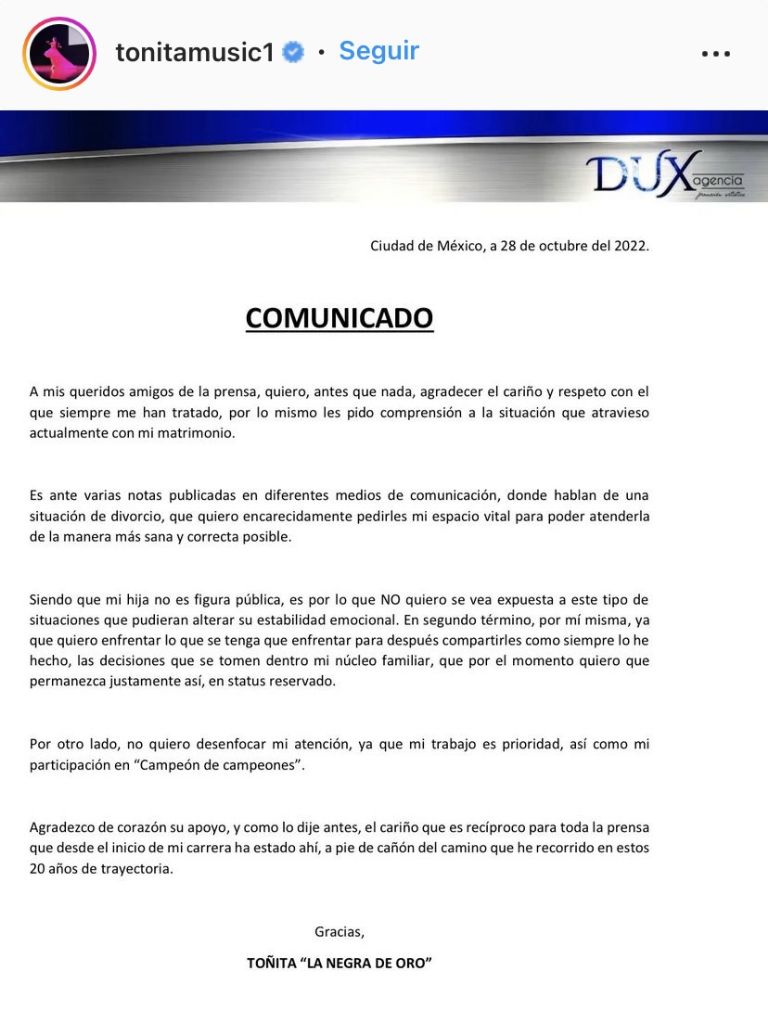 Durante la tarde de este 28 de octubre, Toñita compartió un comunicado de prensa, donde pide respeto por el proceso de divorcio que está atravesando con su exosfera Luis Manuel, pues mencionó que tiene una hija menor y No quiere que salga afectada por las notas que salen sobre dicha situación en la farándula.