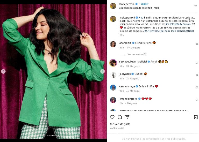 Familia siguen sorprendiéndome cada vez más!!! Quiénes ya han comprado alguno de estos looks?? Ésta semana han sido los más vendidos de #SHEINxMaitePerroni. El código MaitePerroni les da un 15% de descuento sin mínimo de compra …#SHEINforAll”, fue lo que compartió la actriz mexicana sobre esta espectacular colección.