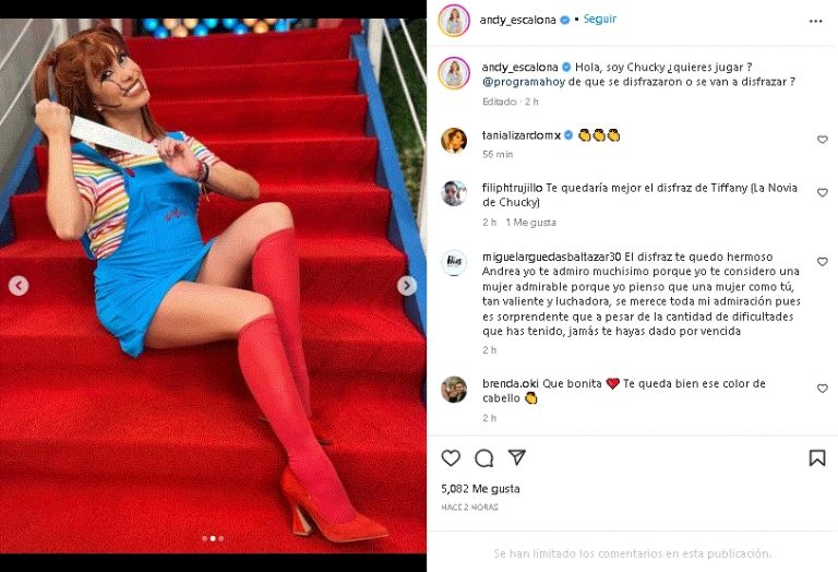 Este consistió en el iconico personas Chucky, pues se le ve con un vestido azul, unas medias rosas y el cabello rojo que enalteció su aclamada figura y gran belleza durante la reciente transmisión del matutino. Incluso aprovechó su publicación para demostrar su gran emoción por los disfraces.