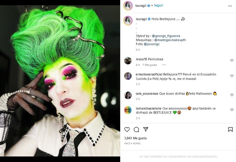 En la instantánea que compartió la presentadora se le puede ver luciendo un elegante jumpsuit blanco con negro y una peluca verde si bien, representan al personaje de Beetlejuice. Además agregó un maquillaje que la hizo ver bellísima frente a los reflectores de la farándula.