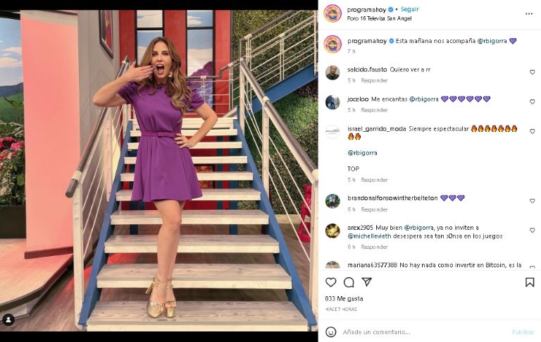 A través de una instantánea subida en los perfiles de Televisa, la estrella de la pantalla chica posó con un ceñido vestido morado que, en gran medida, enalteció su belleza natural frente a los reflectores mexicanos, por lo que sus fans no han dejado de elogiarla y escribirle mensajes de cariño por su gran sentido de la moda, entre ellos destacan: "Guapa", "Hermosa", "Linda", Qué preciosa", entre otros.