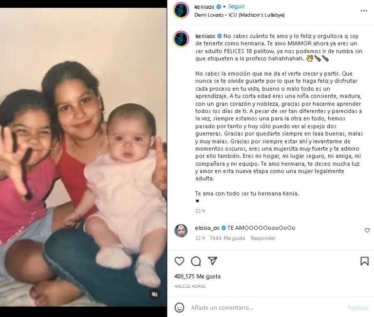 No sabes cuánto te amo y lo feliz y orgullosa q soy de tenerte como hermana. Te amo MIAMOR ahora ya eres un ser adulto FELICES 18 palitow, ya nos podemos ir de rumba sin que etiqueten a la profeco. No sabes la emoción que me da el verte crecer y partir. Que nunca se te olvide guiarte por lo que te haga feliz y disfrutar cada proceso en tu vida, bueno o malo todo es un aprendizaje", se lee.