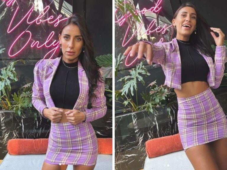 Es tal el impacto de la influencer que cada que publica algo en sus redes de inmediato se viraliza, así que esta vez no fue diferente y le llovieron reacciones y halagos por las fotografías que posteó en Instagram, donde aparece con un conjunto lila, el cual consta de una minifalda ceñida que muestra sus curvas y sus torneadas piernas, un top negro con el que presume su abdomen plano y un saco.