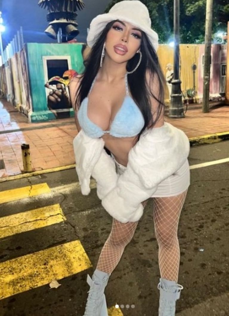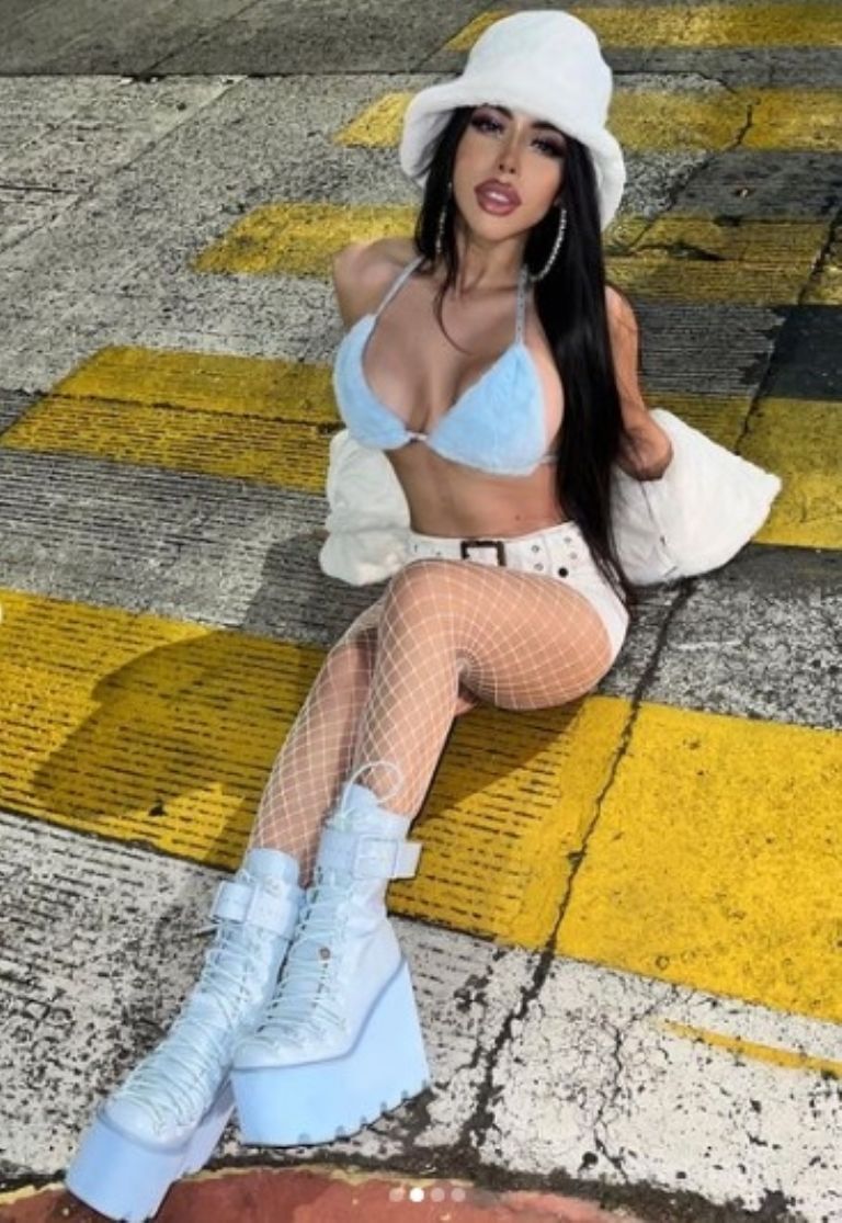 Con mucho flow, la influencer portó una ceñida minifalda de vinipiel en color blanco, un top azul y una abrigo de peluche que hace conjunto con su gorro, para darle un toque más de sensualidad llevó unas medias de red, así como unas botas de plataforma , elementos necesarios para destacarse.