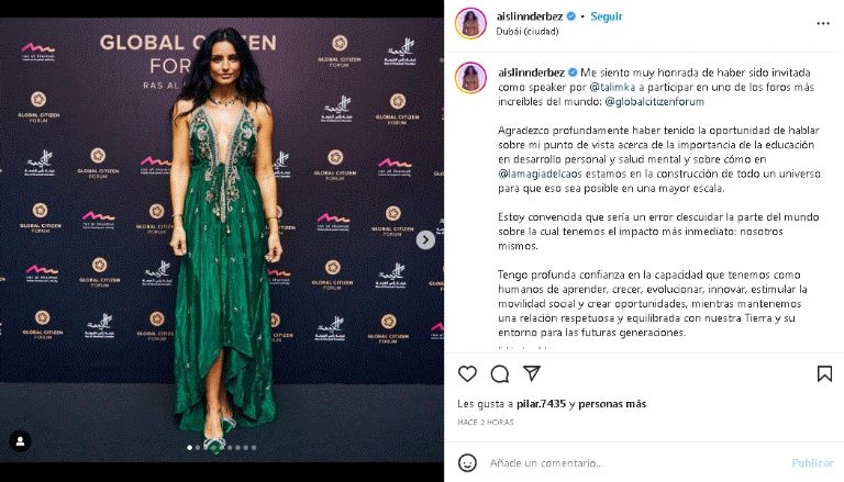 Un outfit que presumió para promover su nueva colaboración de ropa, donde presumió su figura con un destacado conjunto verde con azul: "Me siento muy honrada de haber sido invitada como speaker por @talimka a participar en uno de los foros más increíbles del mundo: @globalcitizenforum".