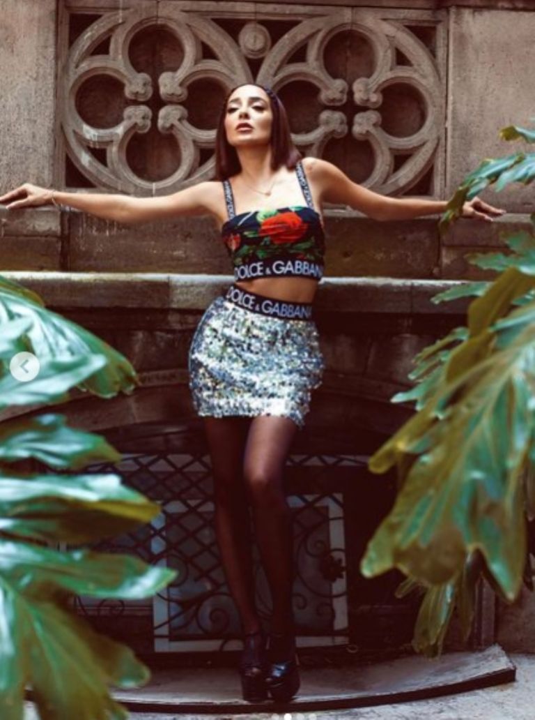 En esta ocasión apareció con un conjunto Dolce & Gabbana, el cual consta de una minifalda de lentejuelas plateadas y un top con estampado de rosas, prendas que enmarcan su curvilínea figura y para darle un toque más chic optó por unas medias negras y unas zapatillas de plataforma estilo Bratz.
