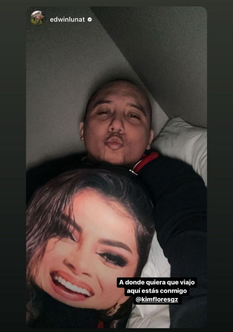 Sin importar que lo critiquen, Edwin está orgulloso de su mujer y a través de su cuenta de Instagram presumió que la lleva en todas partes y recostado desde la cama del hotel, el cantante se tomó una fotografía con su almohada de Kim y escribió: "A donde quiera que viajo aquí estás conmigo".