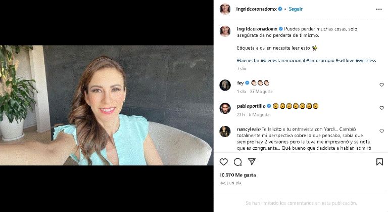 Cabe mencionar que Ingrid Coronado compartió su nuevo libro titulado 'Mujerón', una recopilación textual que narra cómo superar miedos, malas vivencias y batallas internas que yacen en el día a día y que son difíciles de afrontar, pues su principal objetivo es ayudar a sus seguidores a encontrar una paz en su interior con tal de superarse en diferentes áreas.