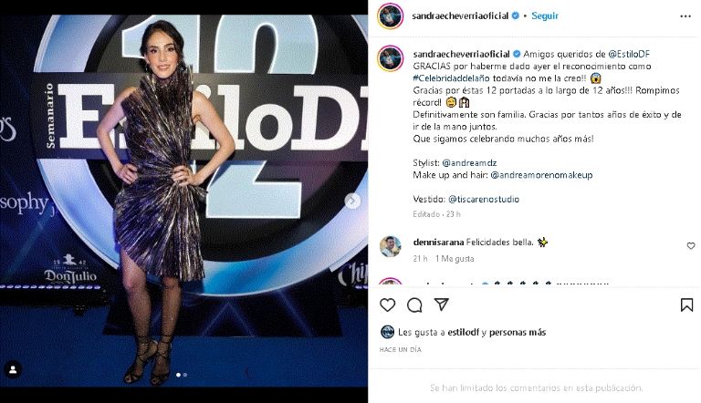 Una imagen que enamoró a todo aquel que la sigue en sus redes sociales, en especial por su buen sentido de la moda que siempre demuestra día con día en Internet y que es ganadora de un sinfín de comentarios por su distinguida apariencia: "Amigos queridos de @EstiloDF GRACIAS por haberme dado ayer el reconocimiento como #Celebridaddelaño todavía no me la creo", se lee en la publicación.