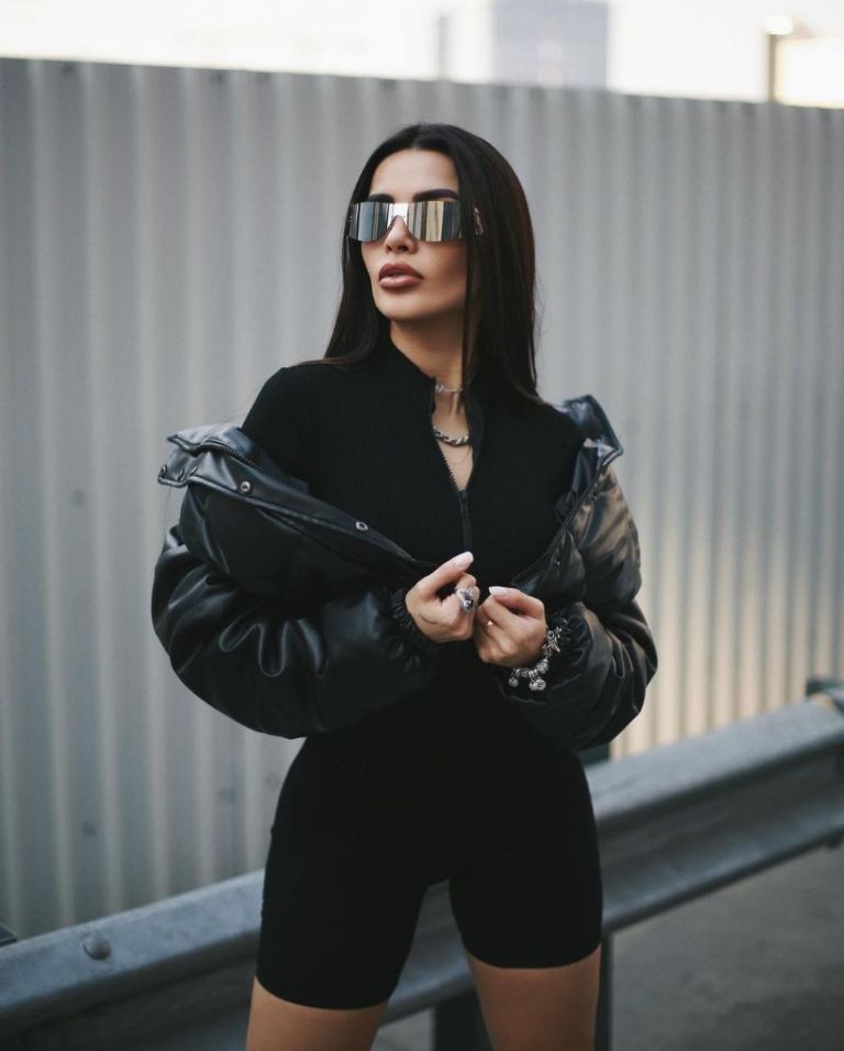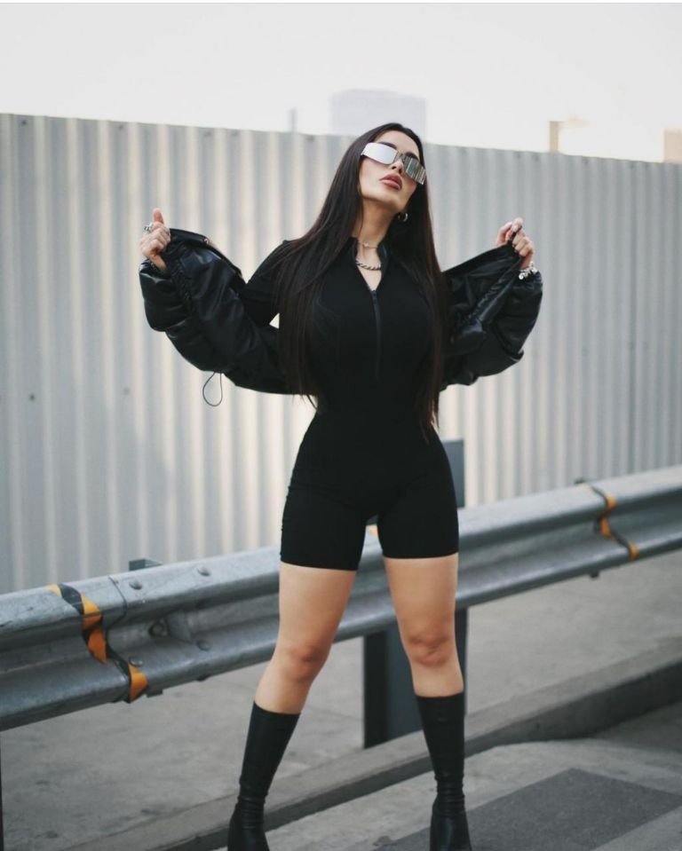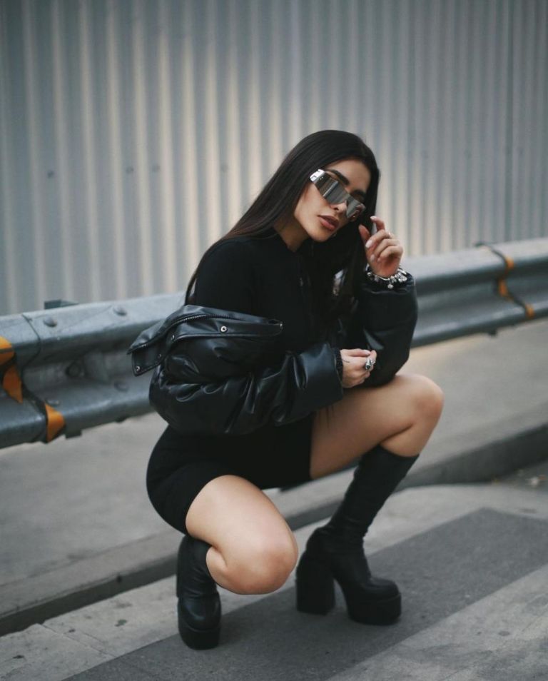 En esta ocasión, la influencer posó con un entallado jumpsuit negro, una bomber jacket y unas botas de plataforma con tacón cuadrado, las cuales estarán dominando toda la temporada al igual que las zapatillas con la misma horma, logrando así un outfit monocromático en el que destacan sus gafas estilo espejo.