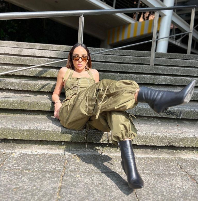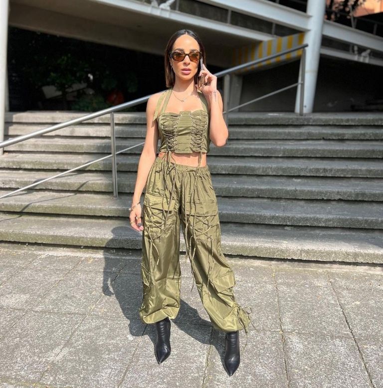 En esta ocasión, la ganadora del segundo lugar de Las Estrellas Bailan en Hoy posó con un conjunto verde que consta de unos pantalones jogger rompevientos y un top de la misma tela, en cuanto a calzado optó por unos botines negros y como accesorios se limitó a unas gafas de sol.