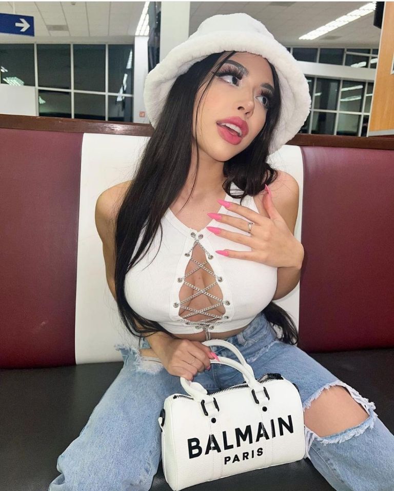 Saliendo de su estilo lleno de brillos, esta vez la llamada 'Bratz Jarocha' optó por un outfit más cómodo y urbano con unos mom jeans rotos, un top blanco que cuenta con un escote pronunciado en el pecho y un gorro de peluche que termina por darle un toque chic.