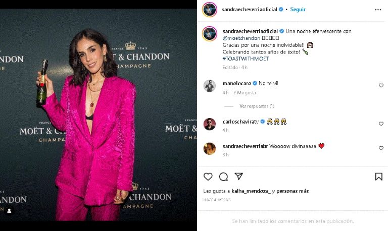 Una imagen que enamoró a todo aquel que la sigue en sus redes sociales, en especial por su buen sentido de la moda que siempre demuestra día con día en Internet y que es ganadora de un sinfín de comentarios por su distinguida apariencia: "Una noche efervescente con @moetchandon", se lee en la publicación.
