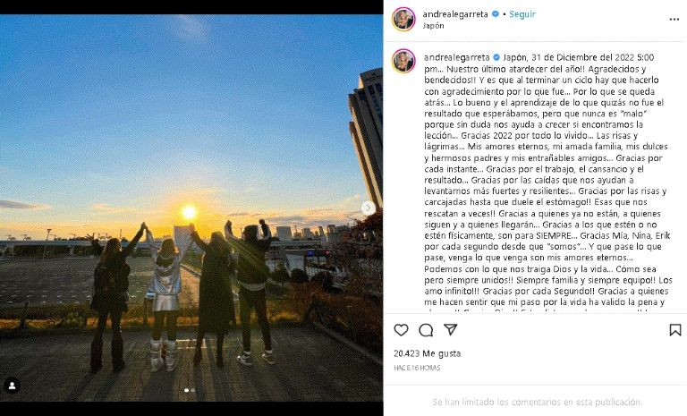 Japón, 31 de Diciembre del 2022 5:00 pm… Nuestro último atardecer del año!! Agradecidos y bendecidos!! Y es que al terminar un ciclo hay que hacerlo con agradecimiento por lo que fue… Por lo que se queda atrás… Lo bueno y el aprendizaje de lo que quizás no fue el resultado que esperábamos, pero que nunca es “malo” porque sin duda nos ayuda a crecer si encontramos la lección… Gracias 2022 por todo lo vivido… Las risas y lágrimas… Mis amores eternos, mi amada familia, mis dulces y hermosos padres y mis entrañables amigos… Gracias por cada instante… Gracias por el trabajo, el cansancio y el resultado… Gracias por las caídas que nos ayudan a levantarnos más fuertes y resilientes… Gracias por las risas y carcajadas hasta que duele el estómago!! Esas que nos rescatan a veces", se lee.