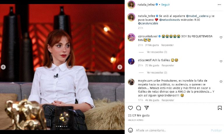La querida conductora de 'Netas Divinas' publicó una coqueta fotografía en su cuenta oficial de Instagram y enamoró a todos sus seguidoresCiudad de México.- La afamada presentadora Natalia Téllez enamoró a sus fieles seguidores de Internet y no por compartir su excéntricos viajes, estilo de vida o los increíbles momentos fuera de los reflectores del espectáculo, más bien publicó una coqueta fotografía que dejó encantados a sus fieles seguidores de Internet. Una publicación que, si bien, sigue siendo tendencia en las redes.
