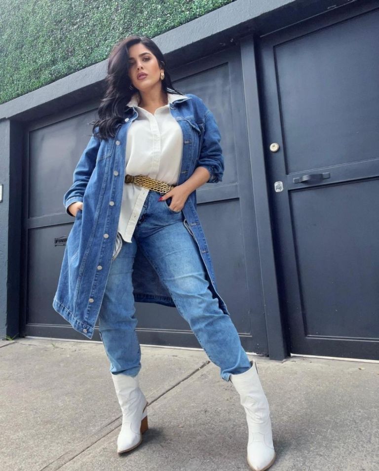 En esta ocasión, la modelo plus size se enfundó en unos mom jeans, optó por una camisa blanca y una cazadora de mezclilla, también entró a la onda cowboy con unos botines blancos y como accesorio un cinturón dorado que fluye con sus arracadas.