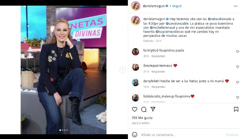 Fue en la resiente transmisión del programa ‘Netas Divinas', el cual comparte con Natalia Téllez, Galilea Montijo, Paola Rojas y Consuelo Duval, presumió su gran belleza que tanto la ha caracterizado desde su perfil de Instagram. En dicha publicación aparece con una destacado pantalón negro y blusa azul que resaltó su encantadora figura.