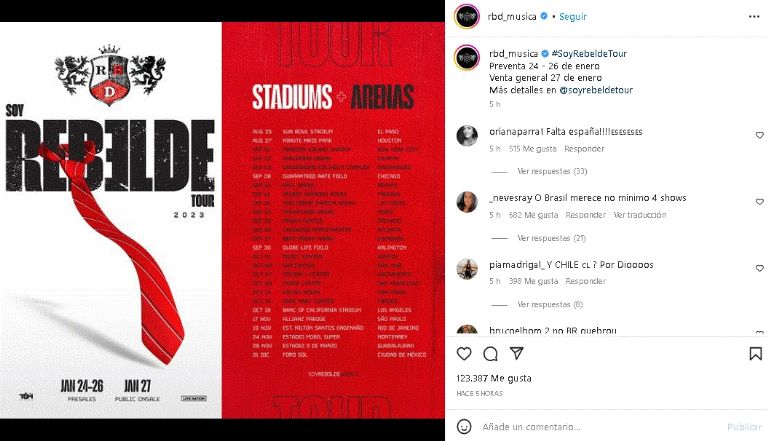 La destacada agrupación mexicana está de regreso en la tarima y esta vez con una gira titulada 'Soy Rebelde World Tour'Ciudad de México.- Luego de hacerse un reencuentro en pleno 2023 y dejar en shock a sus miles de fanáticos, la espera por fin terminó y la agrupación conformada por Anahí, Dulce María, Christopher Uckermann y Cristian Chávez anunció oficialmente las fechas de ‘Soy Rebelde World Tour’. Un anuncio que sigue causando sensación en toda la red, en especial por la espera de la venta de boletos.