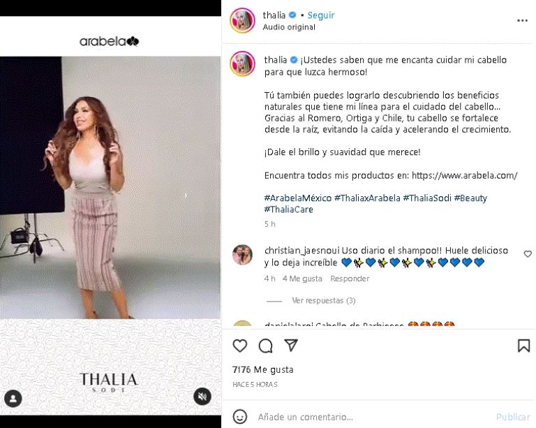 En otras imágenes de la misma publicación también se visualiza a la intérprete de temas como 'No me acuerdo', 'Marimar', 'Desde esa noche', '¿A quién le importa?', 'Qué será de ti' y 'Equivocada' en un set fotográfico, donde promociona un línea de shampoo: "Ustedes saben que me encanta cuidar mi cabello para que luzca hermoso! Tú también puedes lograrlo descubriendo los beneficios naturales que tiene mi línea para el cuidado del cabello".