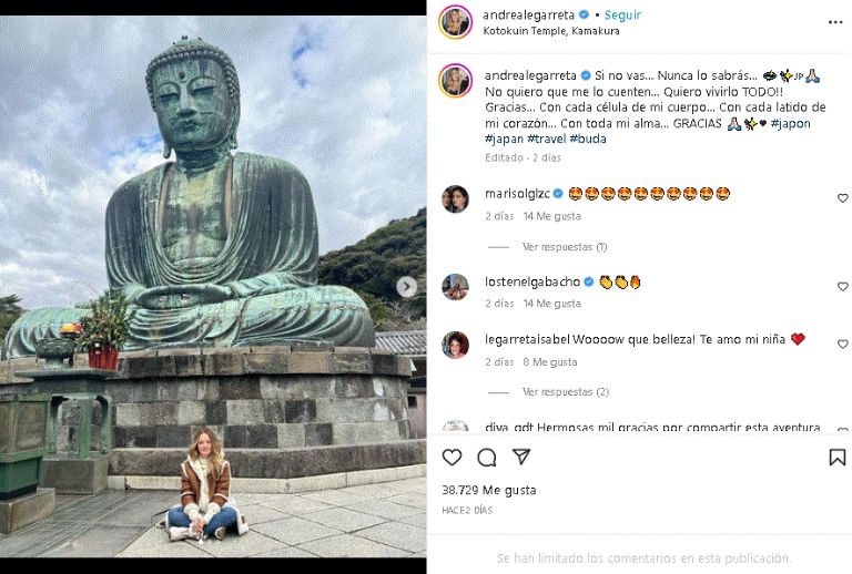 La famosa conductora presumió sus distinguidas vacaciones desde un hermoso lugar y enamoró a sus fieles seguidores de InternetCiudad de México.- La destacada conductora Andrea Legarreta volvió a las redes sociales y para compartir su excéntricos viajes, estilo de vida o los increíbles outfits que usa día con día dentro y fuera de los reflectores, ya que publicó una tierna fotografía, pues enamoró al compartir sus excéntricas vacaciones en japón.