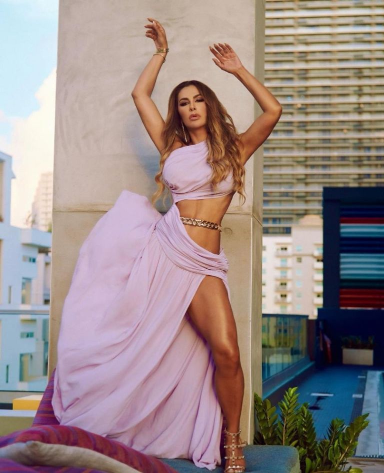 Esta vez el 'Bombón Asesino' sorprendió al aparecer con un maxi vestido en color lavanda que es toda una bomba de sensualidad, pues la falda tiene una pronunciada abertura que permite ver sos torneadas piernas y un corte asimétrico en el abdomen en el que destaca una cadena dorada, mientras que como calzado optó por unas sandalias nude de plataforma.