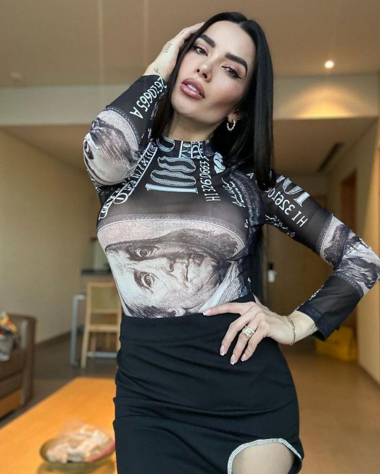 En esta ocasión optó por una minifalda negra, misma que se ciñe perfectamente a sus curvas y que destaca por la abertura que tiene en la pierna con algunos detalles de pedrería, así como una playera de manga larga con estampado de dólar, mientras que como accesorios se limitó a joyería dorada.