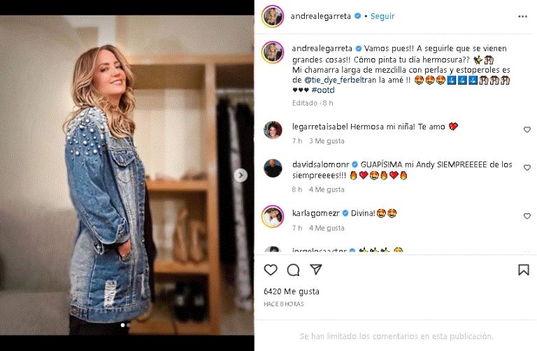 La destacada conductora de 'Hoy' deslumbró las redes sociales, luego de posar con un encantador look de mezclillaCiudad de México.- Andrea Legarreta, famosa estrella y presentadora del programa 'Hoy', demostró su gran sentido de la moda luego de posar con un encantador look de invierno desde su cuenta oficial de Intagram, el cual dejó encantados a sus más de seis millones de seguidores. Un outfit que la dejó lucir radiante lejos los foros de Televisa y del destacado matutino.
