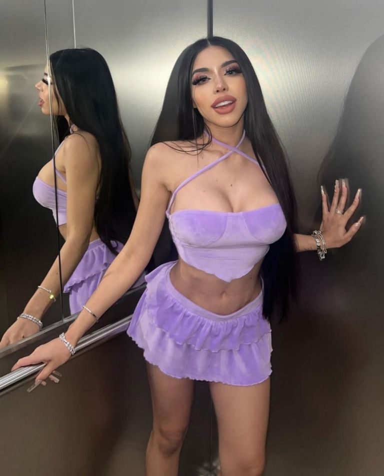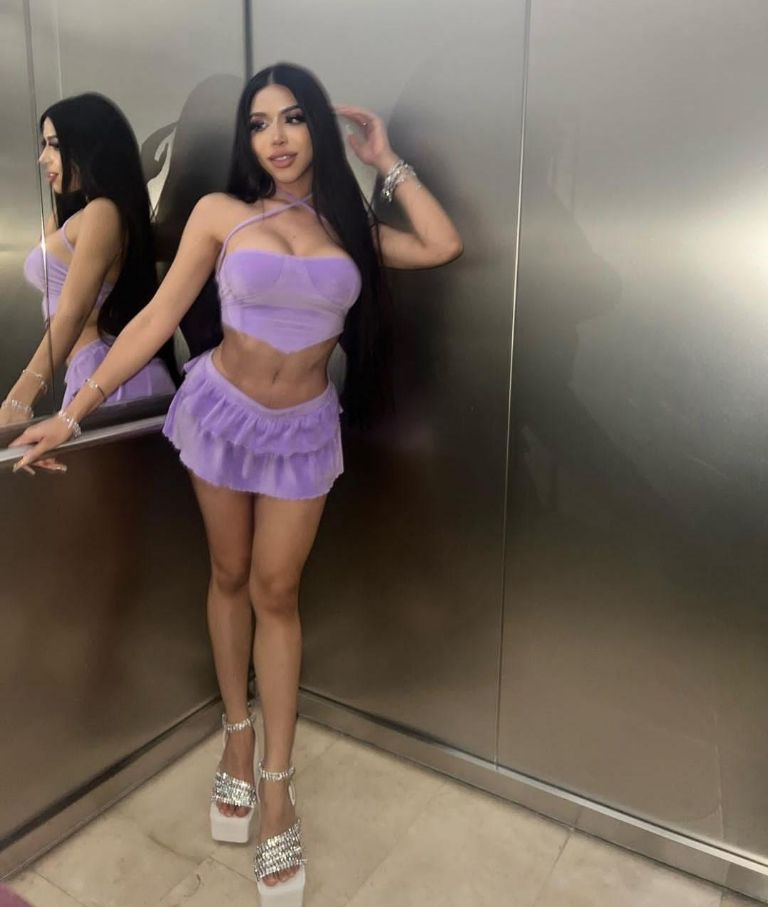 No es secreto que la llamada 'Bratz Jarocha' es toda una fashionista, pues siempre sorprende con sus looks y esta vez no fue la excepción, pues se enfundo en un conjunto morado que consta de una minifalda de holanes que le aporta volumen en las caderas y un diminuto top, mientras que en cuanto a calzado eligió unas sandalias de plataforma plateadas.