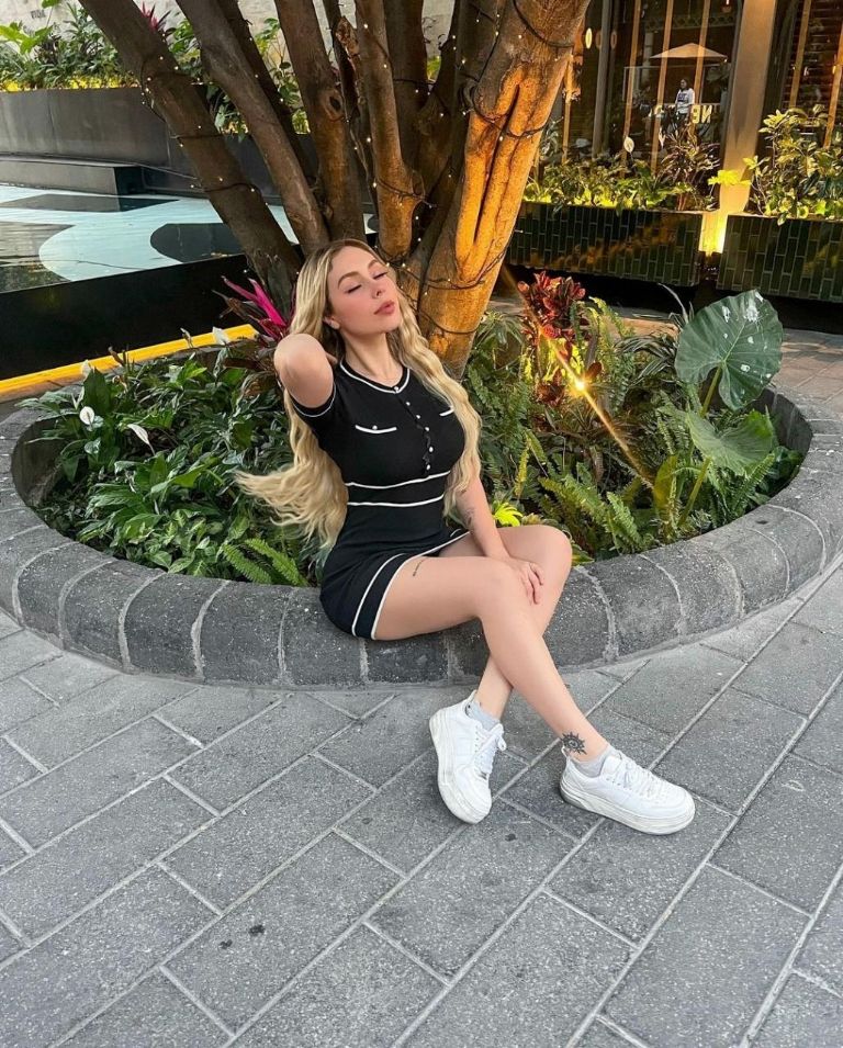 Sentada desde la jardinera de un centro comercial, Maya se dejó ver con un ajustado minivestido negro con blanco, el cual se ciñe perfectamente a su silueta, y aunque el estilo es elegante y se podría resaltar perfectamente con unas zapatillas, la influencer privilegió su comodidad con unos tenis básicos, mismos que le dan un toque más jovial.