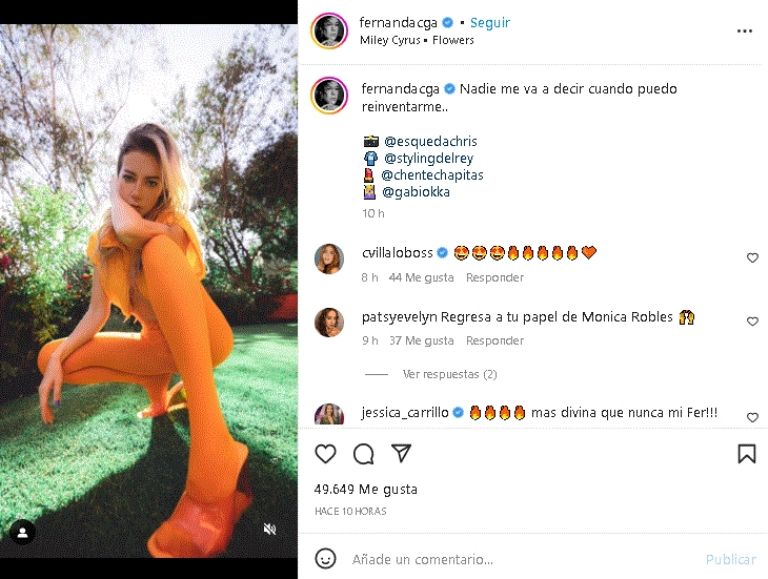 A través de una instantánea desde sus redes sociales, la estrella de la pantalla chica y aclamada estrella de Televisa posó con un destacada conjunto de color naranja que, en gran medida, enalteció su belleza natural frente a los reflectores mexicanos, por lo que sus fans no han dejado de elogiarla y escribirle mensajes de cariño por su gran sentido de la moda, entre ellos destacan: "Guapa", "Hermosa", "Linda", Qué preciosa", entre otros.