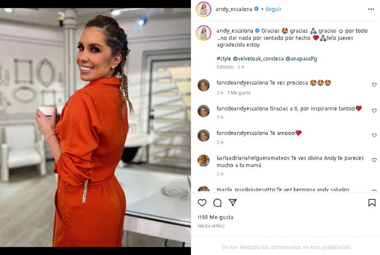 La aclamada estrella de Televisa demostró su gran sentido de la moda, luego de posar con un encantador look naranjaCiudad de México.- Una vez más la querida estrella de la televisión, Andrea Escalona, demostró su gran sentido de la moda, luego de posar con un encantador look de invierno desde los foros de Televisa. Un don que robo suspiros a sus fieles seguidores y que la hizo lucir radiante tras dar a luz a su primer hijo.