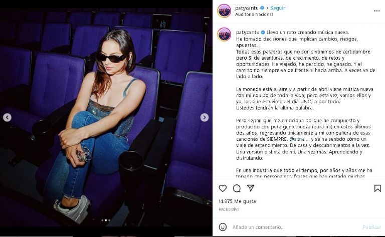 Es duro y a veces duele. Mucho. Sigue siendo una industria y yo sigo siendo una persona, una MUJER que invierte sueños, arte, fe… pero aquí estoy. Lista para ver cómo se desenvuelve todo lo que está por venir… sentada en la butaca de un lugar dónde toque por última vez (solita), hace 3 años… soñando y decretando el día en que nos toque volver", escribió la artista sobre su carrera musical.