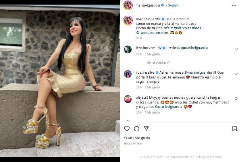 La destacada estrella de las telenovelas volvió a demostrar su gran sentido de la moda, luego de posar con un encantador outfit doradoCiudad de México.- La aclamada estrella de telenovelas, Maribel Guardia, hizo brillar su gran sentido de la moda frente a las cámaras del espectáculo, luego de presumir su figura con un distinguido outfit de día desde la comodidad de su hogar. Una publicación que dejó en shock a sus fieles seguidores de Televisa