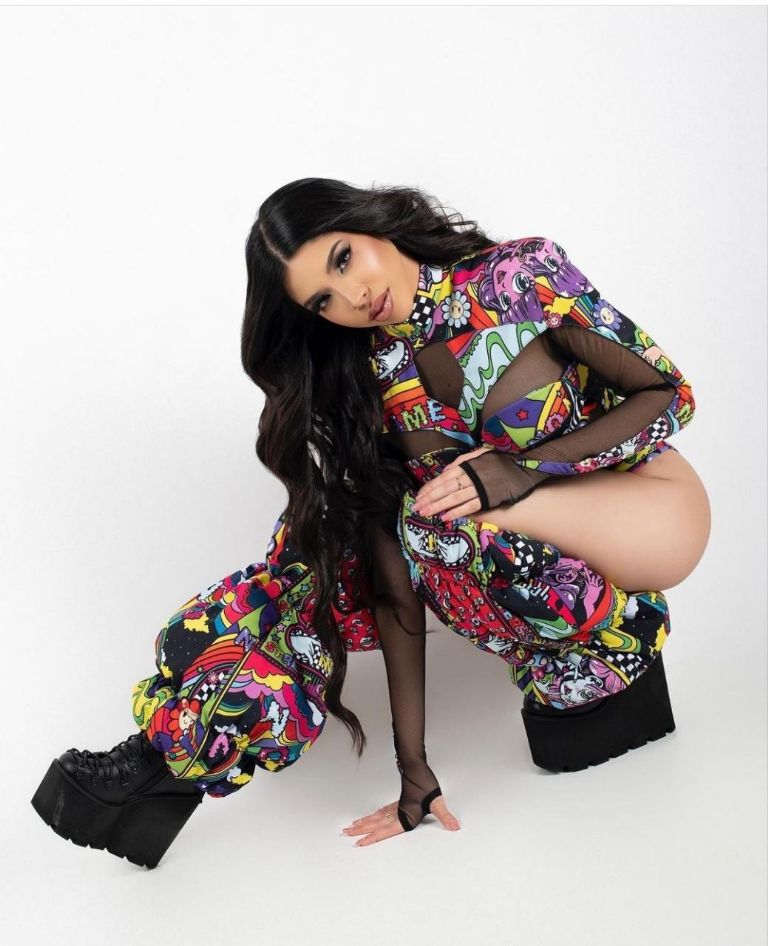 Para esta significativa ocasión, la llamada 'Bratz Jarocha' eligió convertirse en una bomba de sensualidad al enfundarse en un outfit con estampado pop art, mismo que consta de un body con mangas de transparencia y unos calentadores abullonados, así como unas alocadas botas de plataforma.