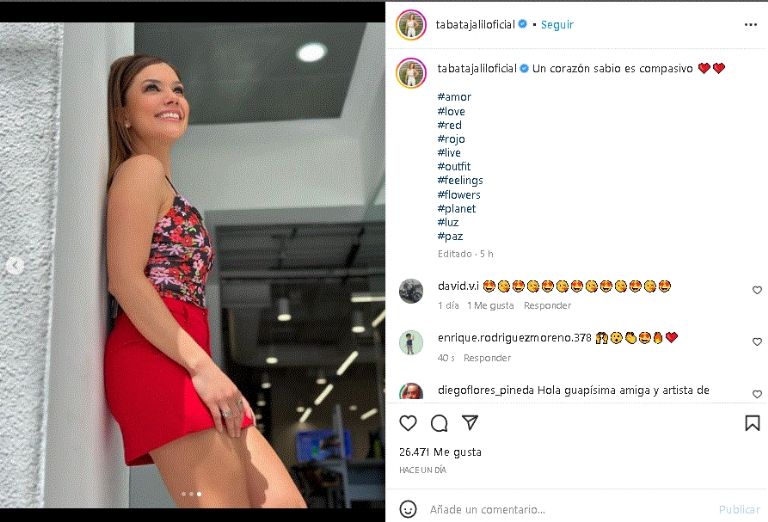 La querida estrella de TV Azteca demostró su gran sentido de la moda, luego de posar con un encantador look rojo en InstagramCiudad de México.- Si algo caracteriza a la gran estrella de televisión, Tabata Jalil, es su gran sentido de la modal, mismo que demostró desde los foros de TV Azteca al aparecer de los más sonriente y con un coqueto look de día. Un don que no dudó en compartir en su cuenta oficial de Instagram para deleitar a sus fieles seguidores y que sigue siendo tendencia en toda la red.