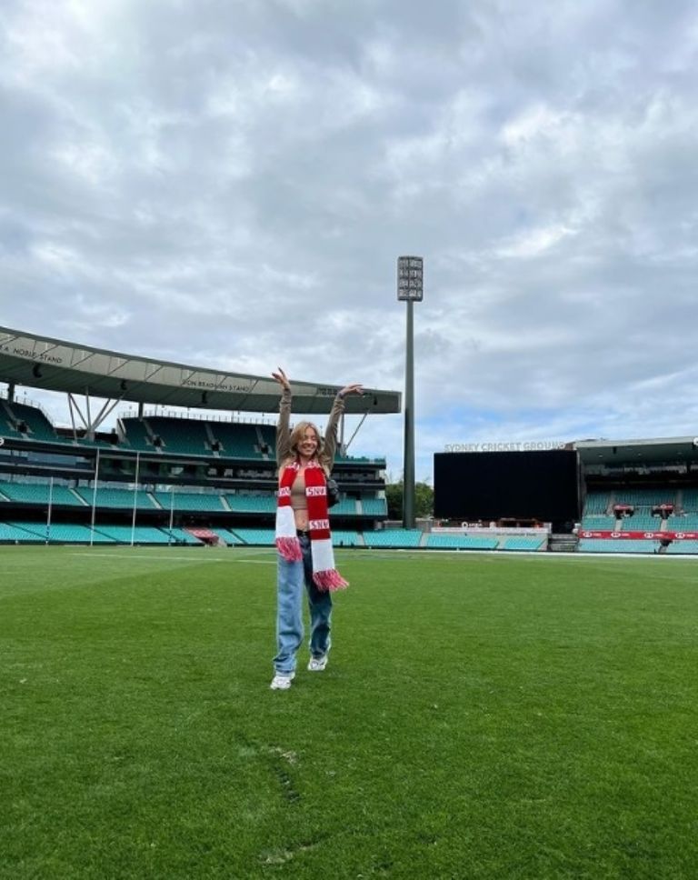 ¿Qué sería un viaje para ver a un equipo deportivo que comparte el mismo nombre que tú sin hacerte una foto junto a uno de sus carteles? Eso es precisamente lo que Sydney Sweeney hizo en la primera toma mientras la actriz posa junto a una pantalla iluminada animando a los Sydney Swans. Tomando las cosas en el centro del campo, la actriz de The White Lotus demuestra su propia destreza física, mostrando un conjunto de volteretas mientras mece una bufanda de Swans.