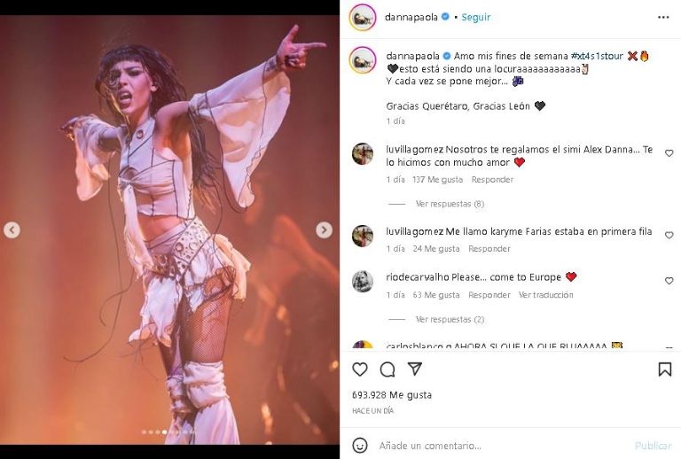 La famosa cantante de pop y género urbano regresó a las redes sociales y esta vez con un encantador look blancoCiudad de México.- La destacada estrella de pop y género urbano Danna Paola deleitó las redes sociales al posar con un coqueto outfit de día como parte de su gira nacional, en la cual tuvo una fecha ayer en Queretaro.. Un atuendo que no dudo en compartir en Internet y que dejó en shock a todos sus seguidores.