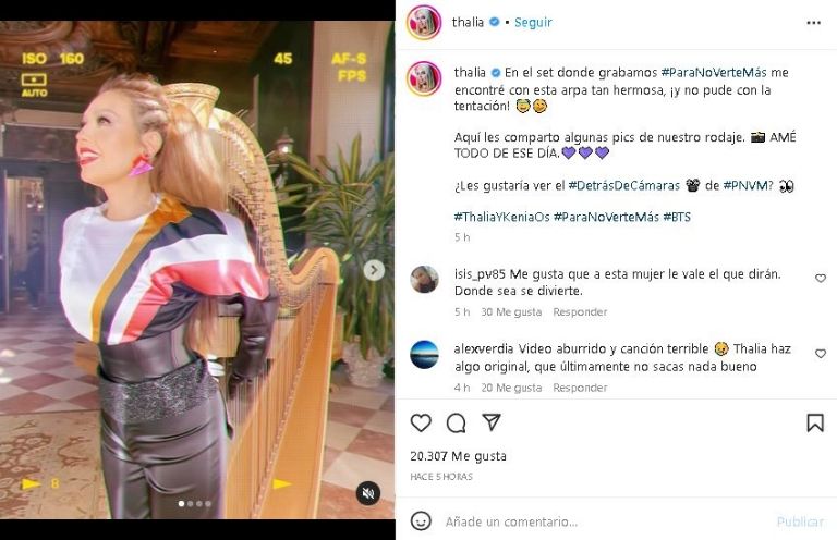 En otras imágenes de la misma publicación también se visualiza a la intérprete de temas como 'No me acuerdo', 'Marimar', 'Desde esa noche', '¿A quién le importa?', 'Qué será de ti' y 'Equivocada' en un set fotográfico, donde promocionasu mpas reciente cover: "En el set donde grabamos #ParaNoVerteMás me encontré con esta arpa tan hermosa, ¡y no pude con la tentación".