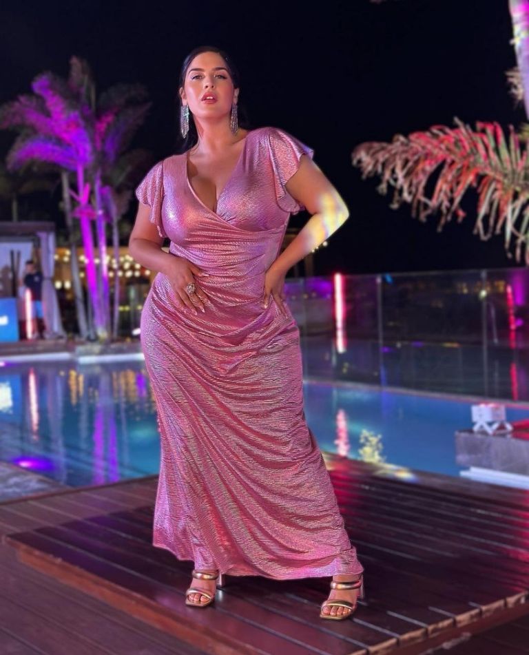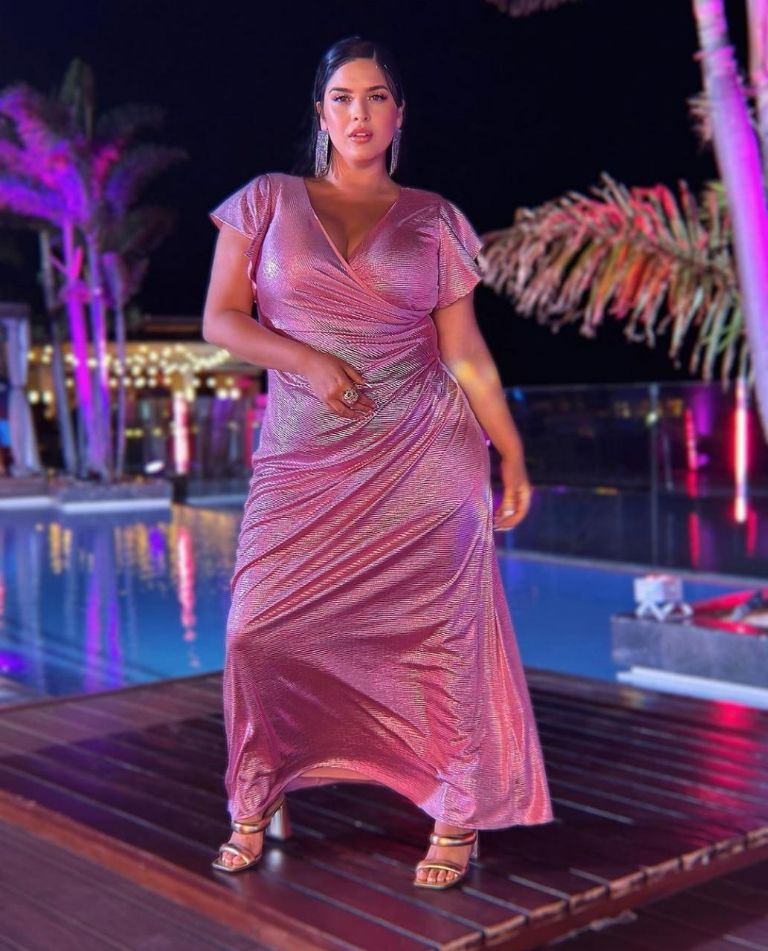 La famosa modelo plus size se enfundó en un vestido largo color rosa con escote en V, el cual deja al descubierto sus encantos, mientras que como accesorios eligió unos aretes y anillo dorado que combinan perfecto con sus zapatillas.