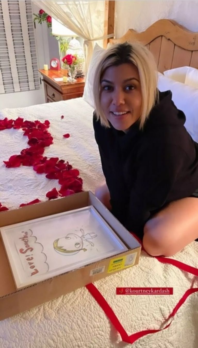 Barker también publicó una foto en su historia de Instagram el miércoles de Kardashian abriendo su regalo en la cama de pétalos de rosa en forma de corazón. La foto mostraba a Kardashian sentada en la cama con una sudadera con capucha negra y una caja abierta que contenía un dibujo enmarcado de un personaje con las palabras "¡Amor! Somethin'" escritas en él.