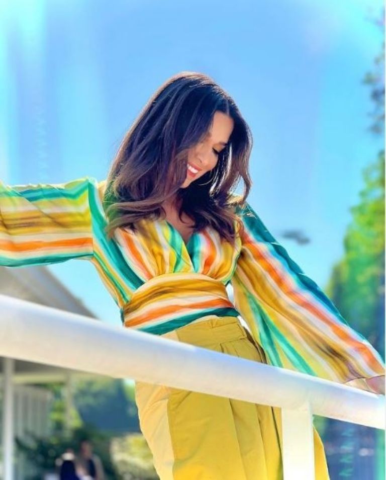 Desde una destacada instantánea en su cuenta oficial de Instagram, la estrella de la pantalla chica y aclamada exestrella de Televisa posó con un pantalón y blusa amarilla con rayas verdes y azules que, en gran medida, enalteció su belleza natural frente a los reflectores mexicanos, por lo que sus fans no han dejado de elogiarla y escribirle mensajes de cariño por su gran sentido de la moda, entre ellos destacan: "Guapa", "Hermosa", "Linda", Qué preciosa", entre otros.