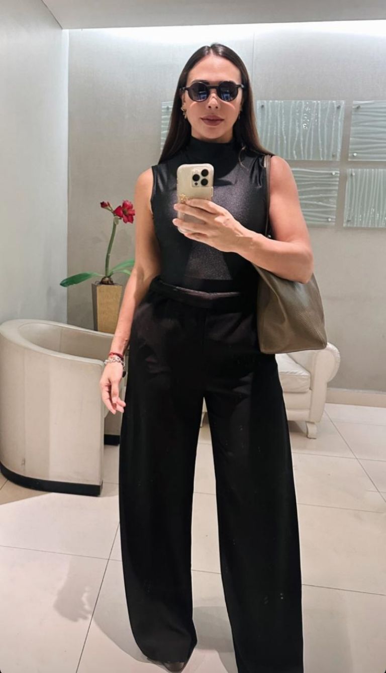 Para quienes gustan lucir más formales, la chica de Contendientes posó con unos pantalones de vestir de pierna ancha que están dominando la temporada y lo acompaño con un top sin mangas, unas plataformas, lentes y bolso como accesorio logrando un 'look' monocromático, ideal para salir cómoda al centro comercial.