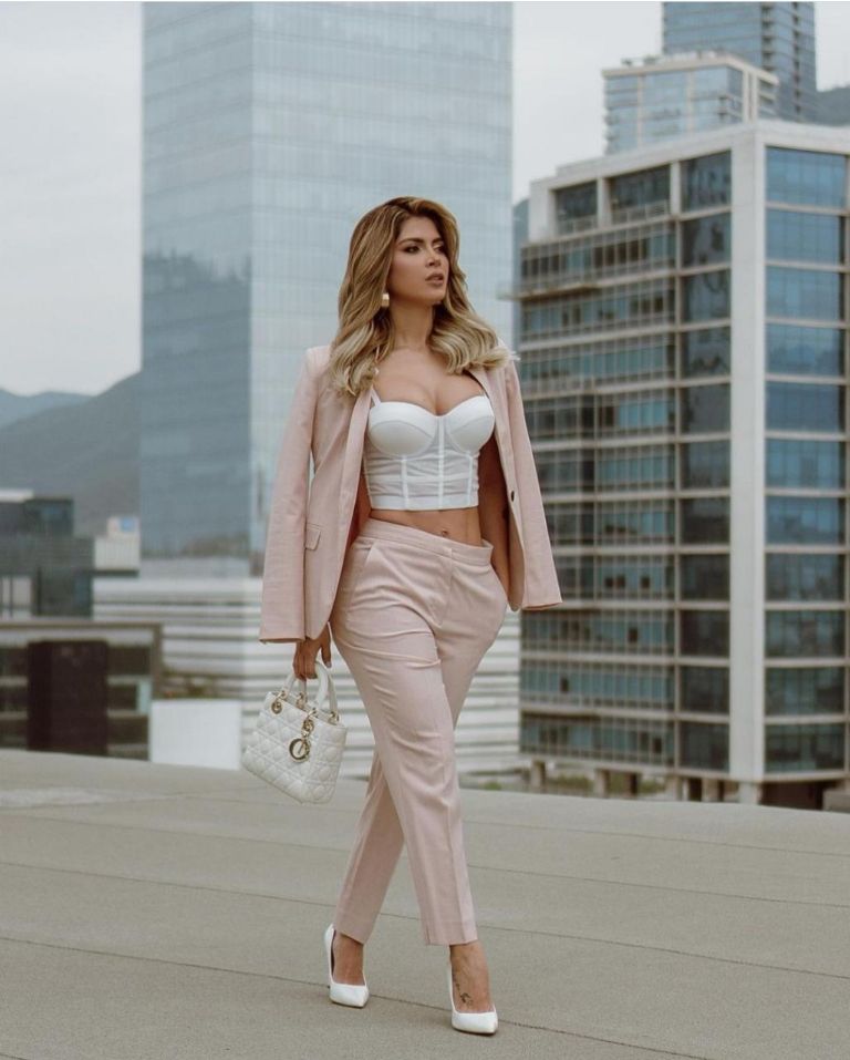 En esta ocasión, Kim optó por una línea casual y sofisticada al enfundarse en un conjunto de vestir rosa, el cual consta de unos pantalones satinados y un blazer, mientras que para darle un toque de sensualidad eligió un bustier blanco del que resaltan sus encantos, mientras que como calzado optó por unos clásicos stilettos que combinan con su bolso.