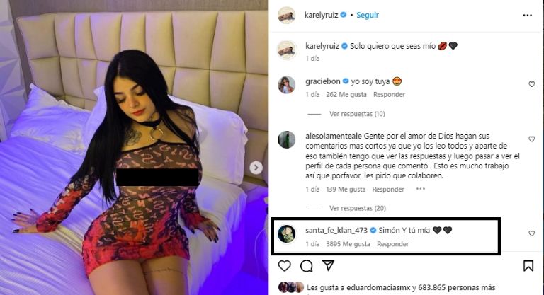 Fue en una reciente publicación de la estrella de OF, donde aparece sentada en la orilla de una cama portando uno de sus reveladores outfits, donde escribió: "Solo quiero que seas mío" y su petición no tardó en obtener respuesta, pues el guanajuatense le dijo: "Simón y tu mía".