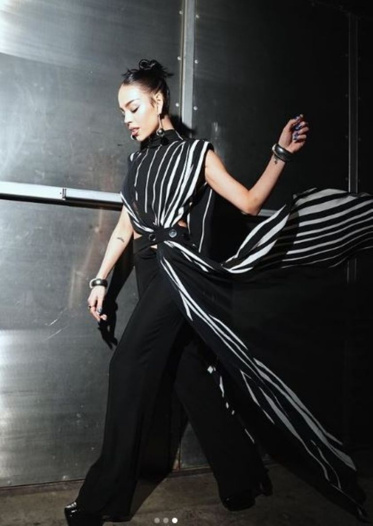 Resulta que la estrella de temas como Mala Fama, Oye Pablo y Sodio impresionó a sus 34 millones de seguidores, luego de posar con un destacado conjunto negro con rallas blancas que resaltó su envidiable figura de infarto, mismo que es envidiado en el medio artístico y que por supuesto, presume cuantas veces aparece arriba de la tarima, la cual demostró su gran sentido de la moda frente a los reflectores del espectáculo.