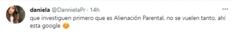 Fue a través de su cuenta de Twitter, donde Dani le recordó a la conductora que existe 'Google' para que investigue y se informe antes de verter su opinión: "Que investiguen primero qué es alienación parental, no se vuelen tanto, ahí está Google", escribió la joven junto un emoji de cara feliz.